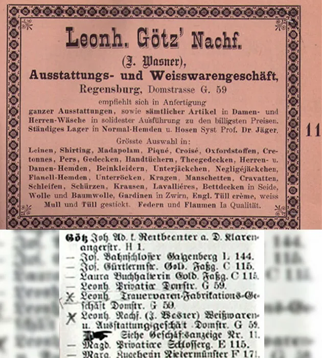 1886 wurde der betriebene Geschäftszweig als „Ausstattungs- und Weißwarengeschäft, Schönfärberei und Druckerei” bezeichnet. Eine im Adressbuch der Stadt Regensburg geschaltete Anzeige empfahl sich zur „Anfertigung ganzer Ausstattungen sowie sämtlicher Artikel in Damen und Herrenwäsche“. Die Schönfärberei trat also langsam in den Hintergrund.